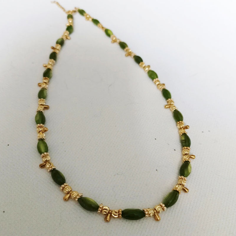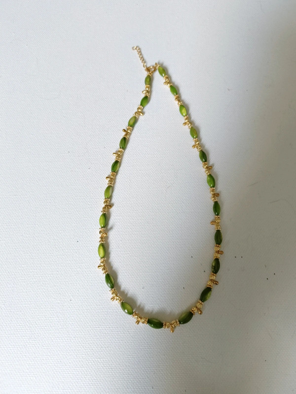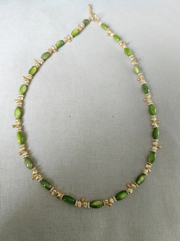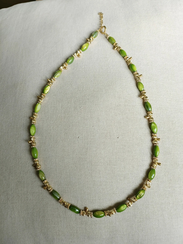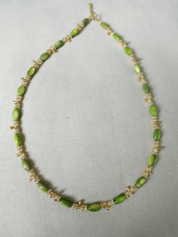 Soyez le premier à laisser votre avis sur “Collier vert et doré perle de coquillage”